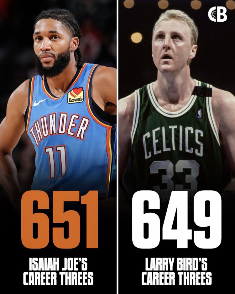直播吧1月10日訊 自媒體Courtside Buzz曬出了一組以賽亞·喬和拉里·伯德生涯三分對比。雷霆球員以賽亞·喬目前生涯出場350場,三分球1618投651中,三分命中率為40.2%。而綠軍名宿