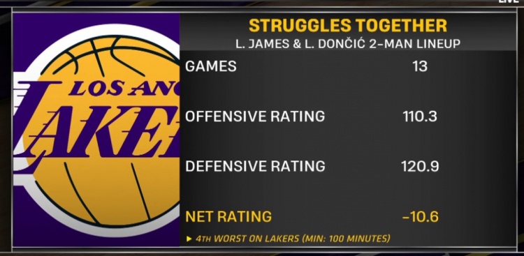 東契奇&詹姆斯同臺13場進攻效率110.3防守效率120.9凈效率-10.6自湖人至少100分鐘同臺的二人組里第4差