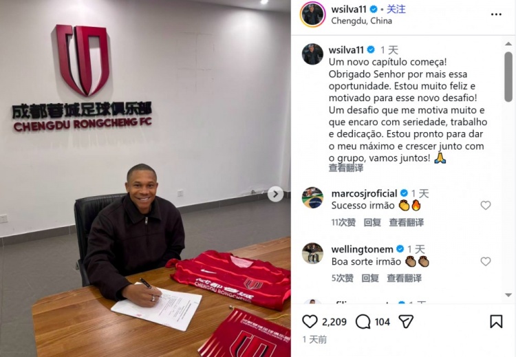 直播吧1月9日訊 成都蓉城簽下前海牛外援韋林頓·席爾瓦,加盟球員更新社媒談到自己的蓉城感受。