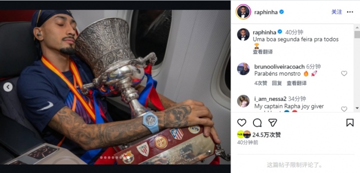 決賽對皇馬獨進兩球!拉菲尼亞更新個人社媒:祝大家周一愉快??
