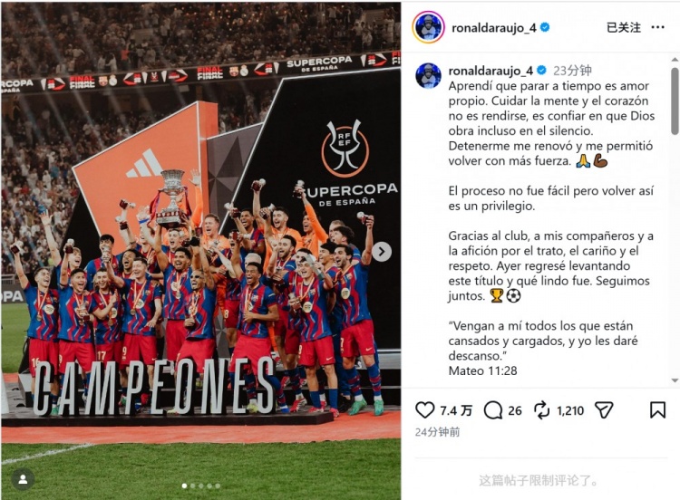 直播吧1月13日訊 巴薩后衛(wèi)阿勞霍更新社媒動(dòng)態(tài),談到了復(fù)出并隨隊(duì)贏得西超杯的感受。阿勞霍社媒曬出捧杯照片,并寫(xiě)道:“我學(xué)會(huì)了適時(shí)停下是自愛(ài),呵護(hù)心靈并非放棄,而是相信上帝在寂靜中依然施展神跡。停駐讓我2026-01-13